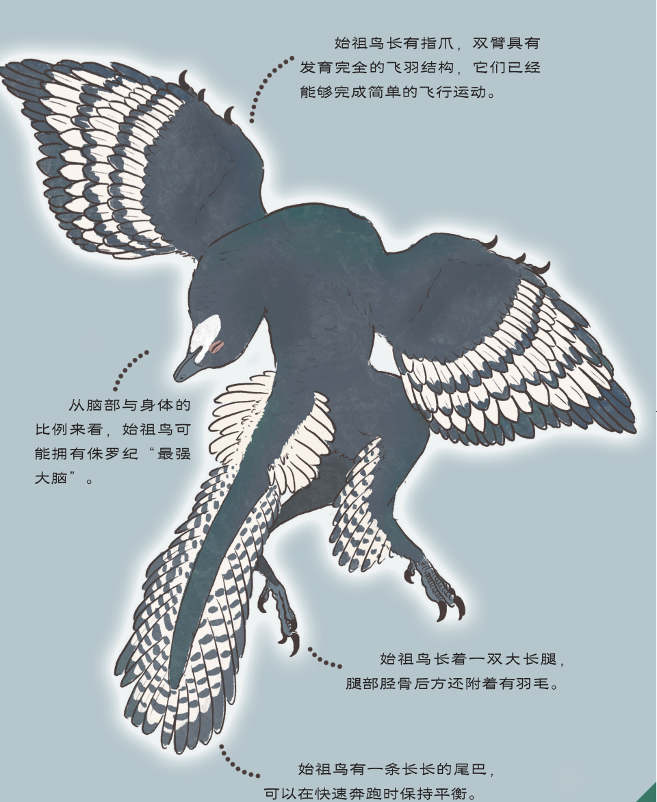始祖鳥長著一雙大長腿,腿部脛骨后方還附著有羽毛。