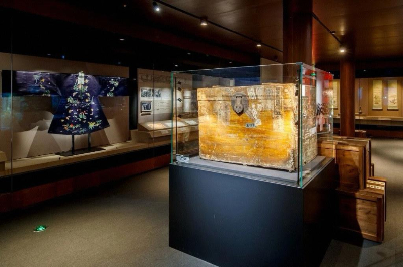 展廳中央,一件斑痕累累、上有不同封條印跡的大木箱吸引觀眾注意。根據檔案記載,箱子內當時裝有284件戲衣等物,隨文物遷徙南下北上。當時裝于箱內的一件清康熙石青色折枝花蝶紋妝花緞女帔同步展出。