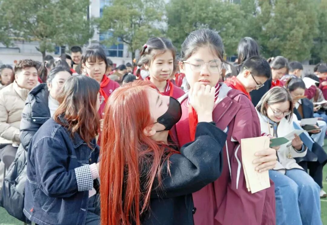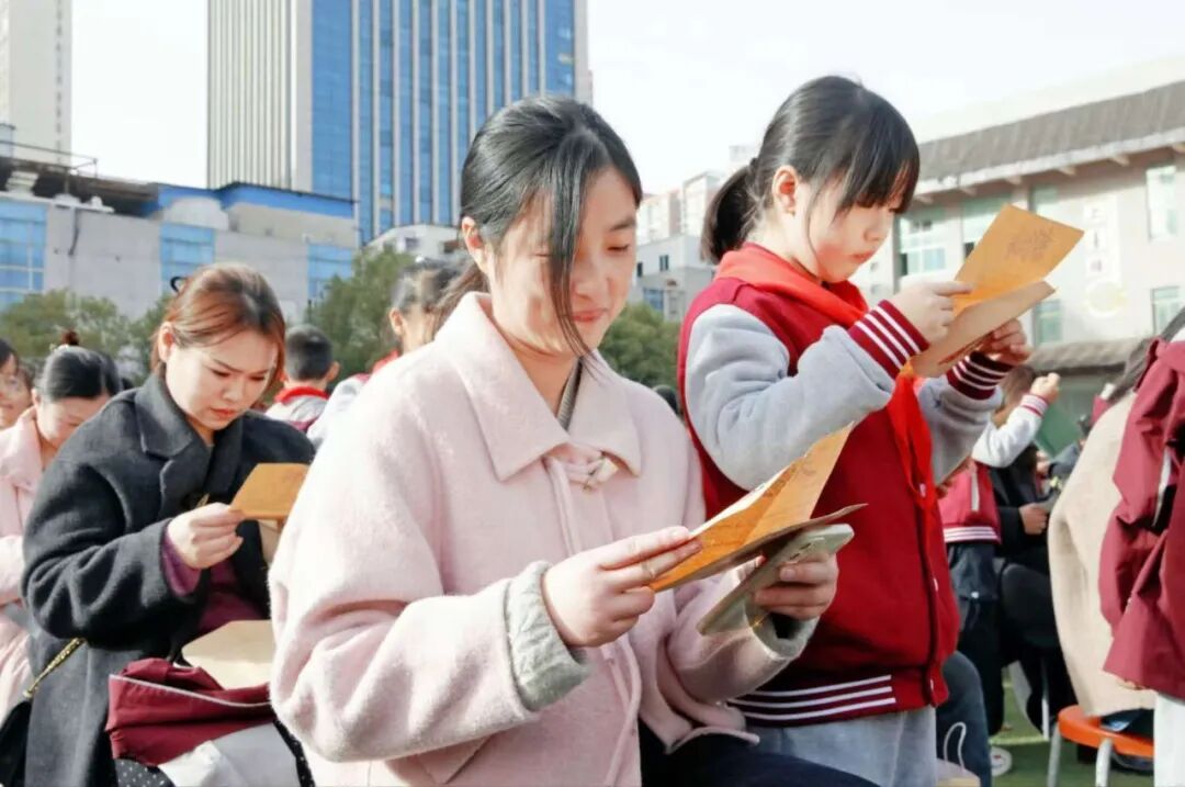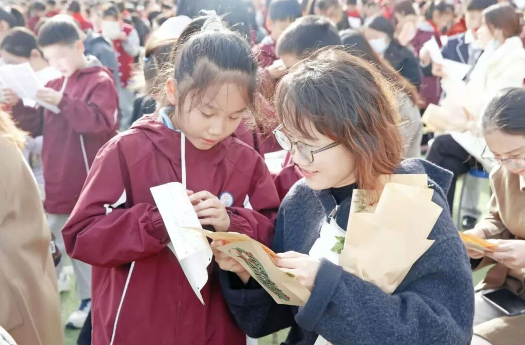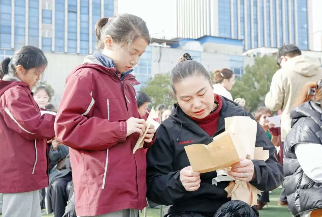 兩點鐘聲敲響了一場溫暖的成長儀式。合唱暖場后,學生代表率先抒發了心中的感恩。隨后,各班用獨具創意的方式立下成長志向;《少年說》的朗朗之聲更是將現場氣氛推向高潮,盡顯少年風采。最后,在信箋傳情的靜默時刻,父母與孩子通過文字進行了一場深刻的心靈對話,無聲勝有聲。