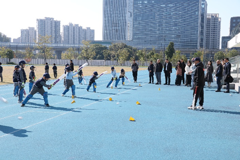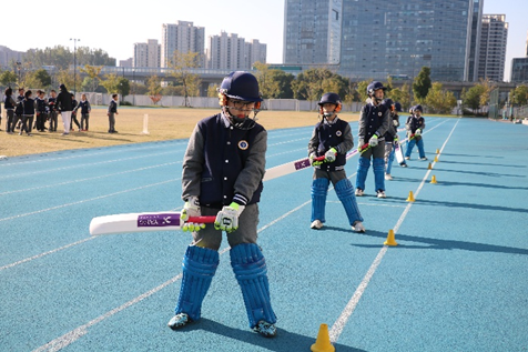 操場上,嘉賓們一起觀摩了“板球擊球挑戰賽”“團隊傳球大比拼”兩項趣味訓練,同學們專注投入的狀態與蓬勃活力打動了在場人員。隨后,桑喬格?古普塔與中國香港板球協會董事阿努拉格?巴特納格爾,應邀參與互動游戲,與同學們共同揮桿擊球、默契傳球。他們為成功完成動作的同學喝彩,現場氣氛熱烈融洽。